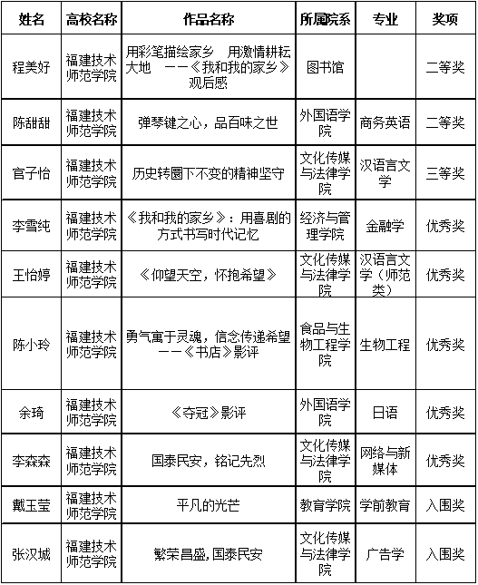 我校此次有效投稿共60篇,包含本科院校组59篇,馆员组1篇,其中10篇作品入围终评。在此次“学问杯”影评大赛中我校图书馆荣获优秀组织奖,馆长赖英腾研究员荣获个人组织奖,馆员程美好老师的《用彩笔描绘家乡 用激情耕耘大地——〈我和我的家乡〉观后感》荣获馆员组二等奖,外国语学院商务英语专业陈甜甜同学的《弹琴键之心,品百味之世》荣获本科院校组二等奖,文化传媒与法律学院汉语言文学专业官子怡同学的《历史转圜下不变的精神坚守》荣校本科院校组三等奖。另有5名同学荣获优秀奖,2名同学获得入围奖。