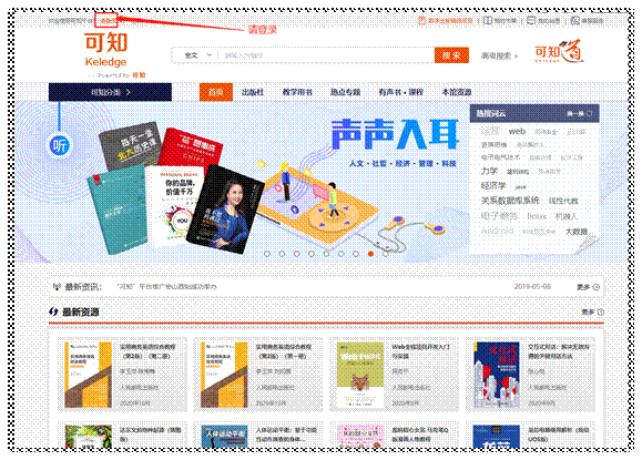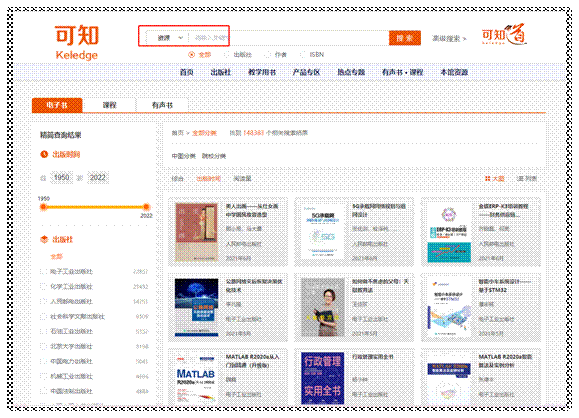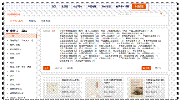 【资源检索】:在首页选择【资源】,根据书名称、作者、ISBN、等关键字搜索,搜索结果支持按照电子书、有声书、课程等方式查看;