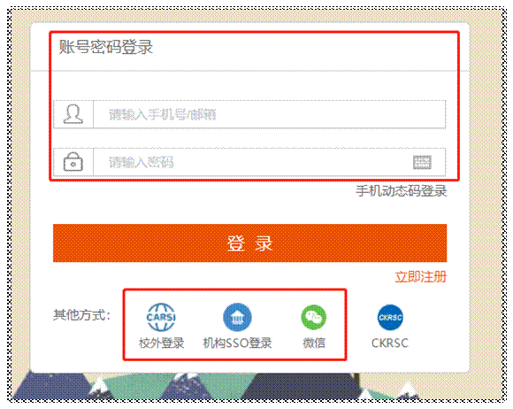 第一步:在登录页面,选择对应的登录方式(支持CARSI、SSO、机构登录以及账户密码),根据操作流程完成填写,点击“登录”按钮,即可登录成功;